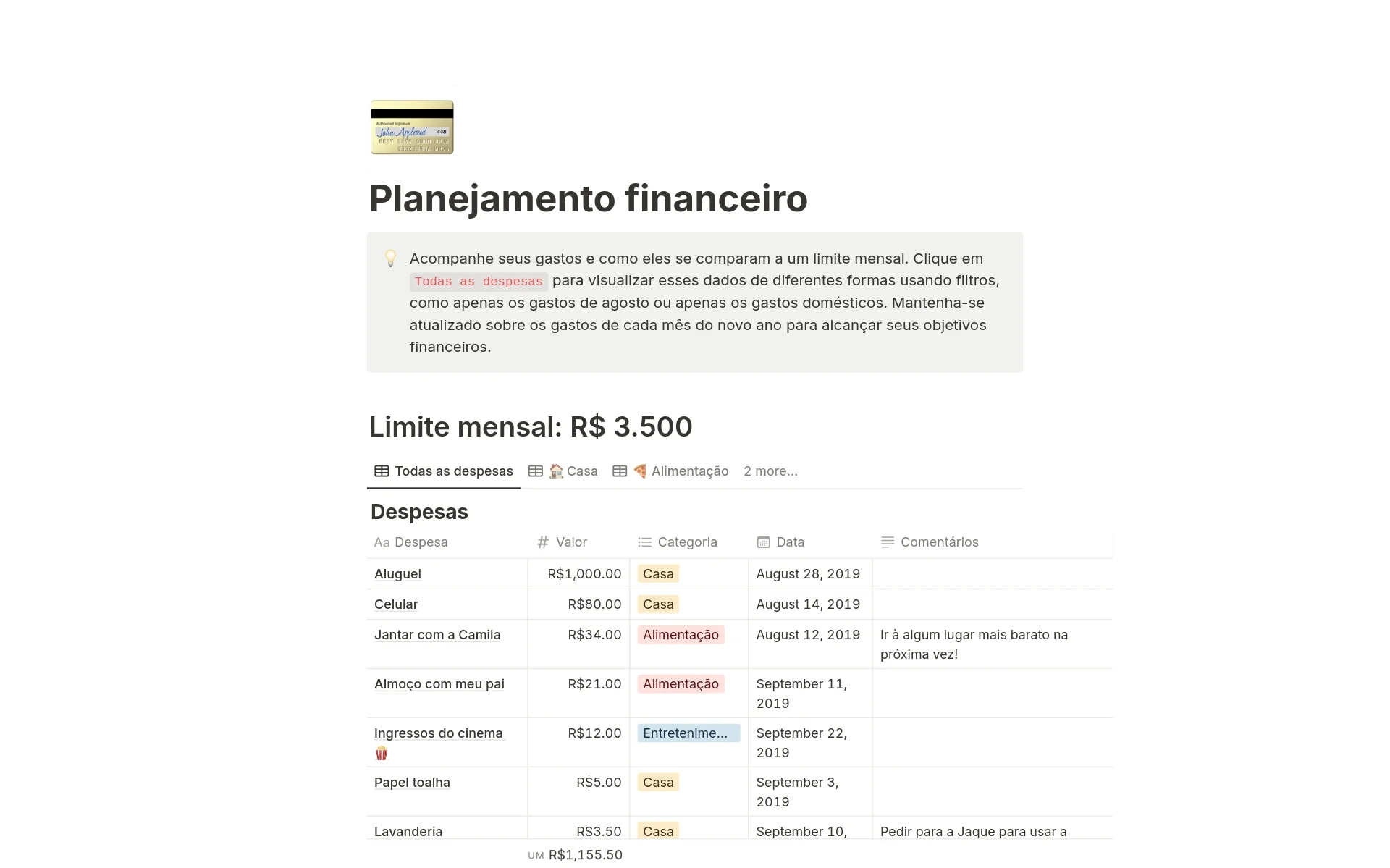 Acompanhe seus gastos para alcançar seus objetivos financeiros. Estabeleça um limite mensal para seus gastos e registre suas despesas no banco de dados abaixo. Veja seus gastos de diferentes formas, como por categoria ou por mês, utilizando filtros. Você também pode visualizar as despesas em um calendário ou divididas por categoria em um quadro estilo Kanban. Saber Mais